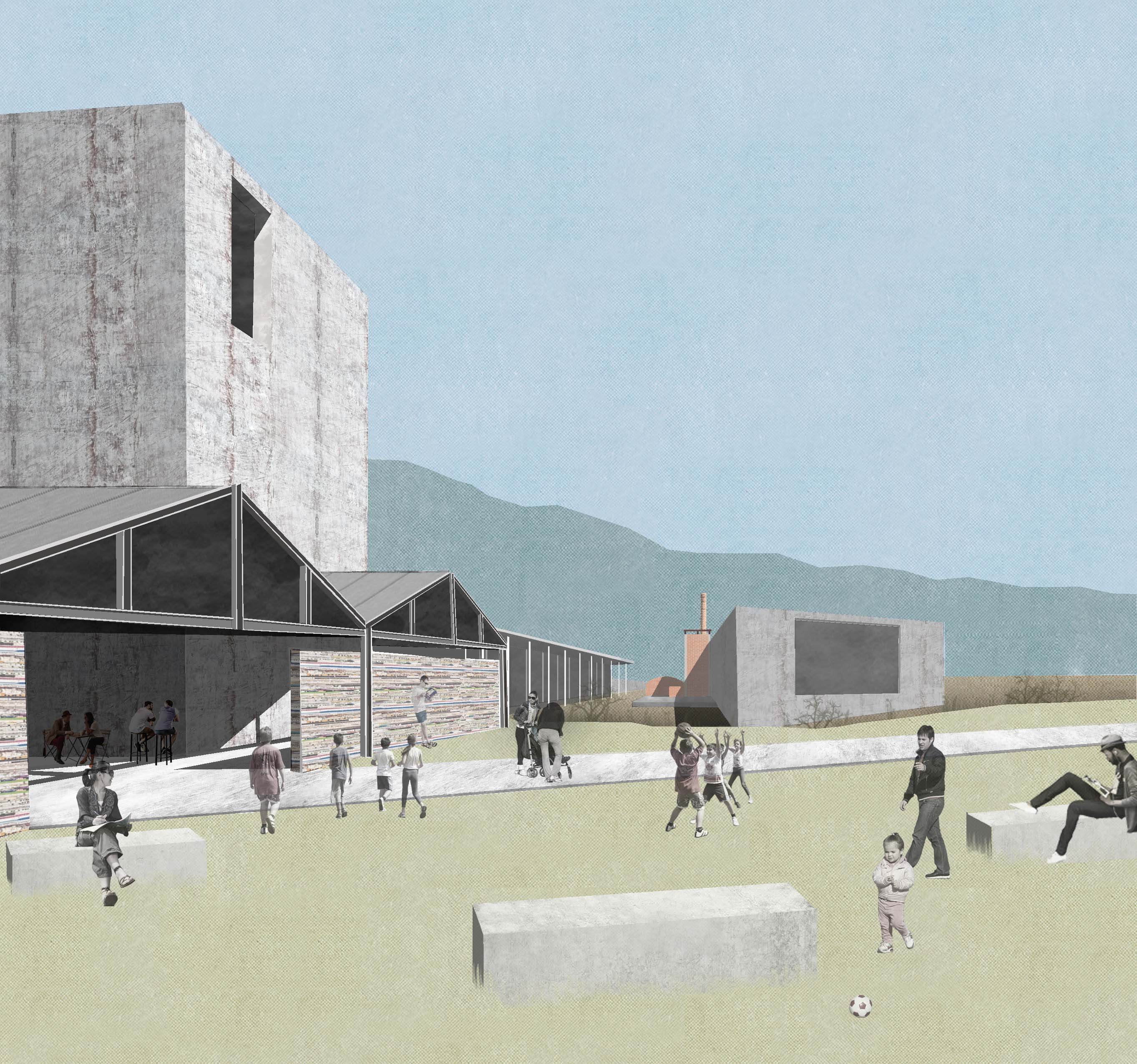 Une place centrale permet d’accéder à l’ancienne manufacture de papier devenue auditorium et café et conduit également à la bibliothèque. Dans le prolongement de la place, une passerelle conduit à l’ancienne serre agricole réhabilitée en espace d’exposition et salle de workshop.